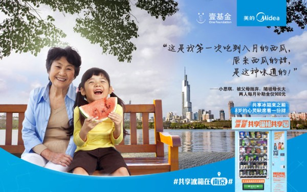 美的冰箱携手壹基金打造的爱心共享冰箱坐落于城市贫困人群较多的社区街道,一改传统共享冰箱的任意打开存取模式,采用自动贩卖机设计,为外来务工人员、失独老人、残疾家庭、贫困儿童等受助者带来领取食物的机会。每天,工作人员会检查捐赠的食品,登记后用标签注明有效期,放入冰箱。而受助者可以随时来,透过玻璃选择食物,然后刷卡领取,但每人每天最多能领三次。以此为食品安全、稳定供给及受助人群食物合理分配提供有力保障。