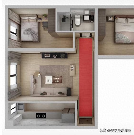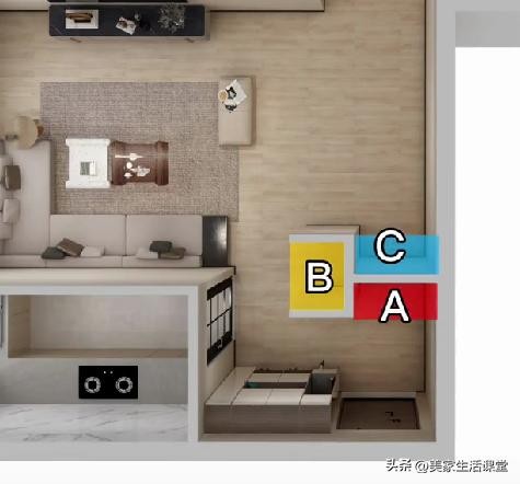 通过新建L型轻质隔墙,形成黄金三角功能模块: