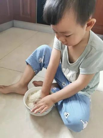 孩子在无限允许的情况下,才有更多的机会挖掘他自己的潜能。小家伙对米情有独钟。每次煮饭的时候,小家伙总是吵着让他来量米。量好米,还喜欢用量米桶再舀再倒,一次次不断地尝试。后来,干脆就用手反反复复去抓。有时会把米撒了一地,我就对他说:“这么多米撒出来多可惜,下次松手的时候,要把米放到这个米桶里哦。”有一次,他惊奇地叫道:“妈妈,我按出了一个手印。”孩子在不断的摸索中有所发现,获得内心的喜悦。