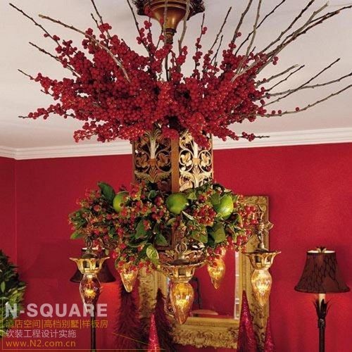 在吊灯掉挂上红色丝带与小苹果装饰,多有喜庆气氛。