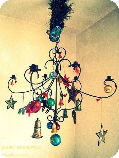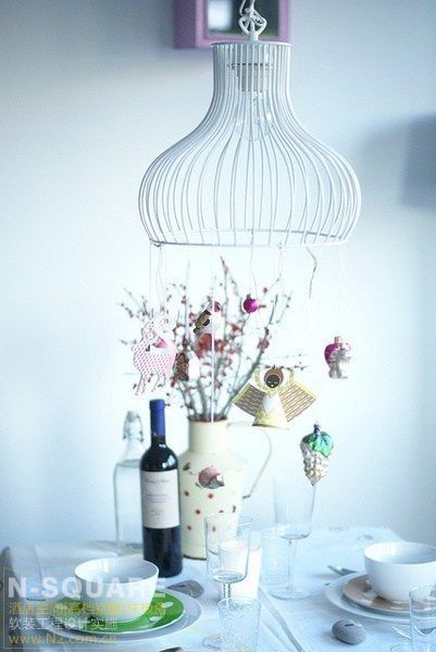 在一个现代装饰感的的线条灯具里,如何将这种极具现代感的气息更有温馨的节日气氛呢?用细绳子绑上几个小饰品、要注意的是用不同长度的细绳配合,错落有致的装饰看上去是不是有点像风筝呢?