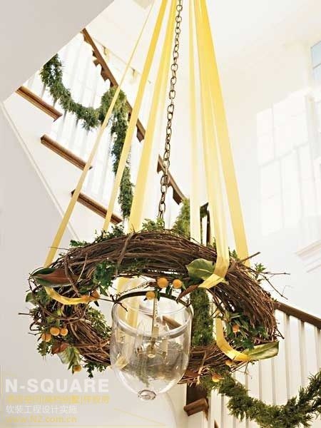用圣诞花环来装饰长形的灯饰,再用黄色丝带包裹其中,优雅的圣诞灯具轻松完成。