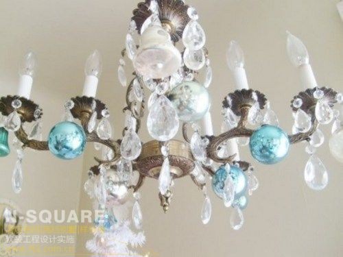 水晶主题的灯饰搭配上水蓝色的圣诞球很像童话世界。