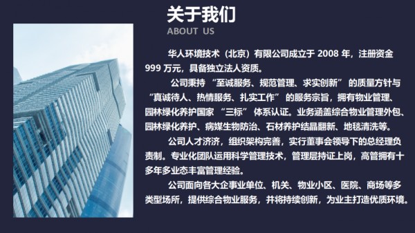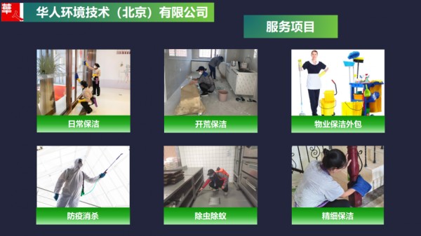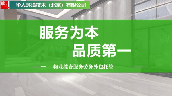 综合物业劳务外包服务:企业日常保洁、酒店保洁、客房保洁、公区保洁、安保中控人员、工程维修、园林绿化养护、病媒生物***等综合物业服务,长期外包托管。 华人环境技术(北京)有限公司,成立于2008年,注册资金999万元。是一家具有独立法人资质的企业。 公司公司从成立之初就本着“至诚服务、规范管理、求实创新”的质量方针,为客户提供高水准、专业化、深层次的服务。拥有物业管理,园林绿化养护国家“三标”体系认证。 承接综合物业管理外包服务、园林绿化养护服务、病媒生物***、消杀除虫灭鼠除四害服务、石材养护结晶翻新服务、地毯清洗等服务。 公司云集了众多技术人才和具有丰富管理经验的物业管理人员,具有完善的组织架构,实行董事会领导下的总经理负责制,公司拥有一支的专业化队伍,实施科学、规范和现代化的管理技术,保持与时俱进的管理水平。公司严格要求部门员工参加培训,管理层持证上岗,公司高管具有十多年涵盖培训中心、大厦、4S店、宾馆等多种业态的丰富管理经验,所管项目都被评为市级物业管理项目,是全国首批注册物业管理师。 公司将继续坚持“真诚待人、热情服务、扎实工作”的服务宗旨,通过科学的管理和诚信的服务,给业主及使用者创造一个温馨 、舒适、洁净、安全的工作、生活环境。同时企业员工们将一如继往,鼓足干劲,与时俱进,***创新,以高昂的斗志,饱满的热情,再谱服务新篇章。 公司承接各大企事业单位、大型跨国公司、机关单位、物业小区物业小区、医院、养老院、大厦、商场、写字楼、工业园、工厂、公寓、汽车4S店、学校幼儿园、银行等综合物业服务项目。项目不分远近,服务人员就近安排上岗。