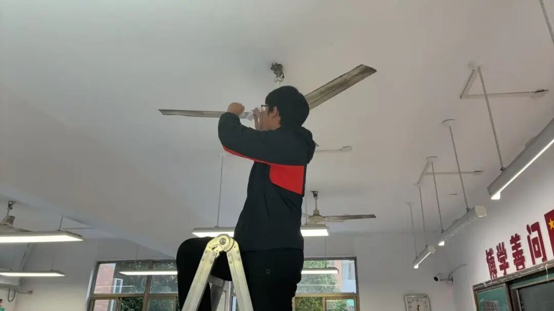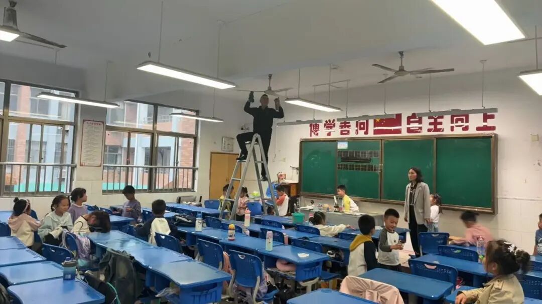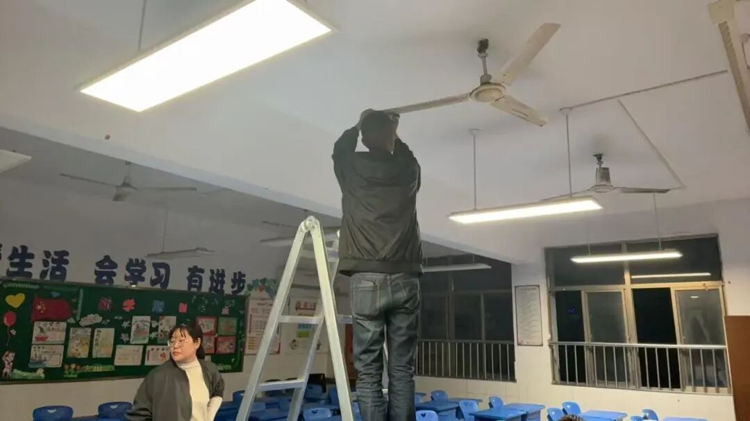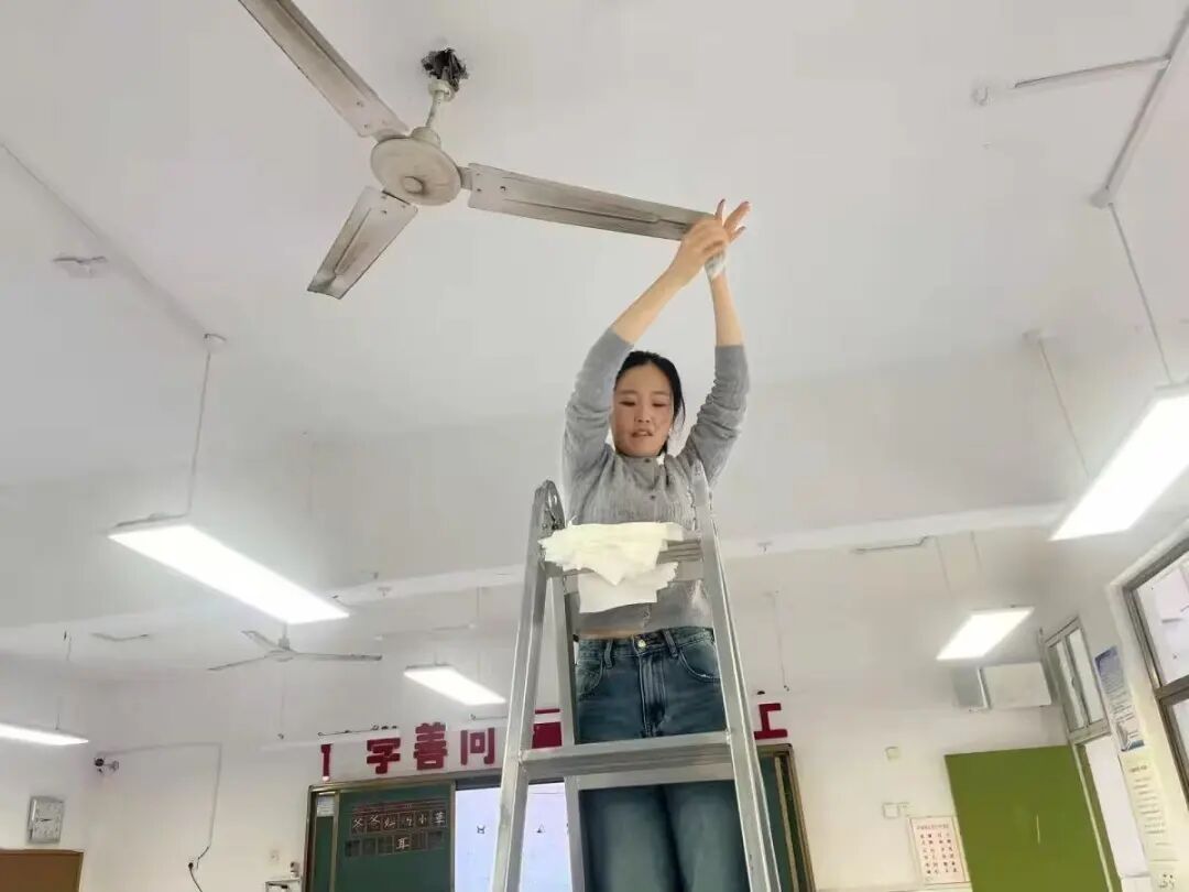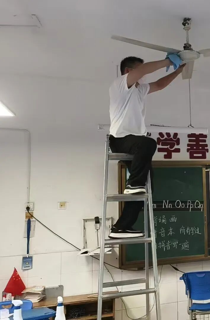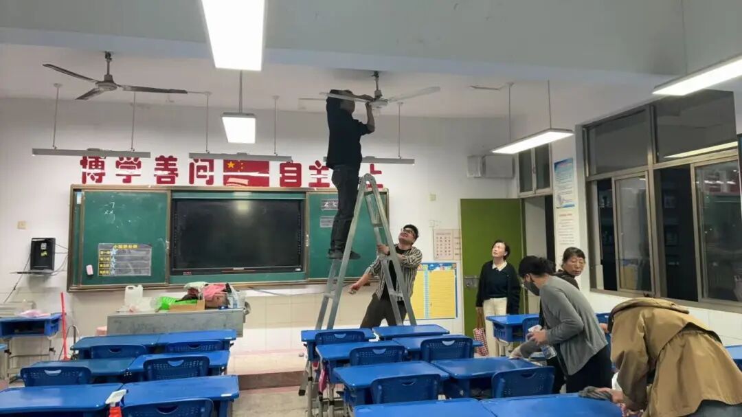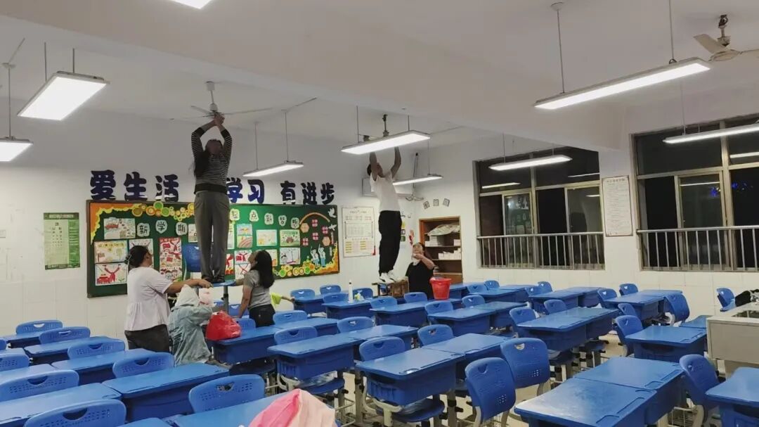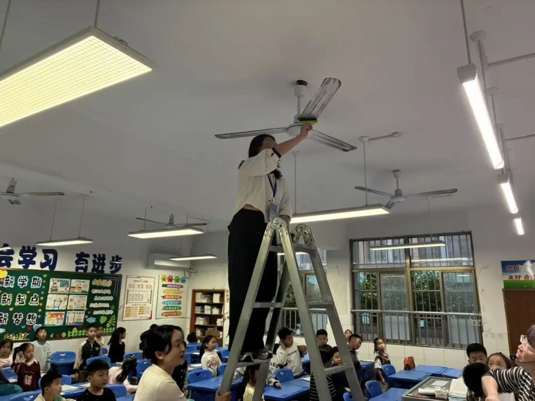 女教师沙美玲、许梦凡、李瑞娴、汪明珠等克服恐高心理亲自登梯,细心擦亮电风扇;男教师马瑞、陈洪凯在完成本班任务后,主动协助其他班级,展现出良好的协作精神。部分家长志愿者也在放学后来到教室,帮忙一起清扫教室,有的擦洗桌面顽固污渍,有的清理风扇灰尘。周锦红主任全程协调,不断提醒安全,并陪伴部分班级忙碌至晚上八点,确保了清洁工作的顺利推进。