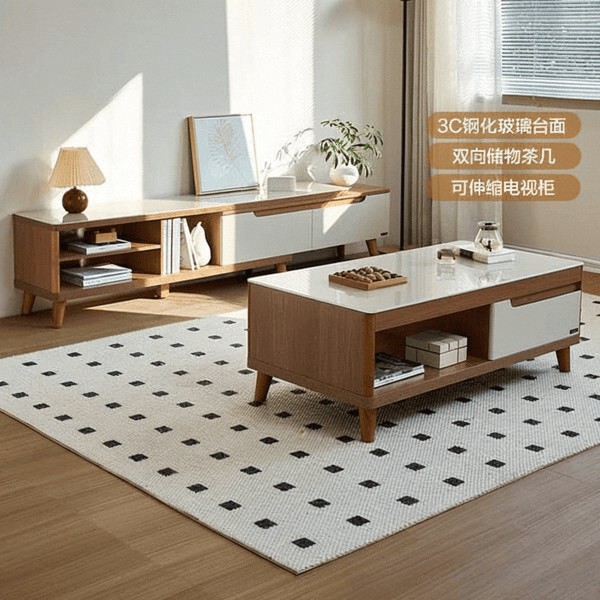 这款茶几与电视柜搭配得天衣无缝,既可作为聚会时的茶水桌,又能当作日常的小餐桌,完美兼顾了功能和美观。一些独特的细节,比如松木的实木材质和岩板的结合,更是提升了整体的品质感,给您和家人营造出一个温馨又舒适的氛围。