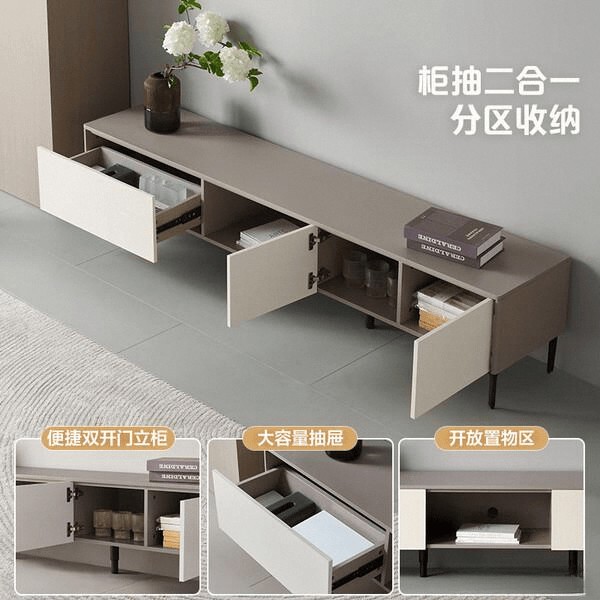 其圆润的边角设计则让安全性大大增强,哪个家里有孩子的小伙伴们都能放心使用。在功能上,这款电视柜绝对不简单。多元分区的储物区域使得收纳变得高效便捷,从遥控器到杂志都能有序归置,保持客厅的整洁。