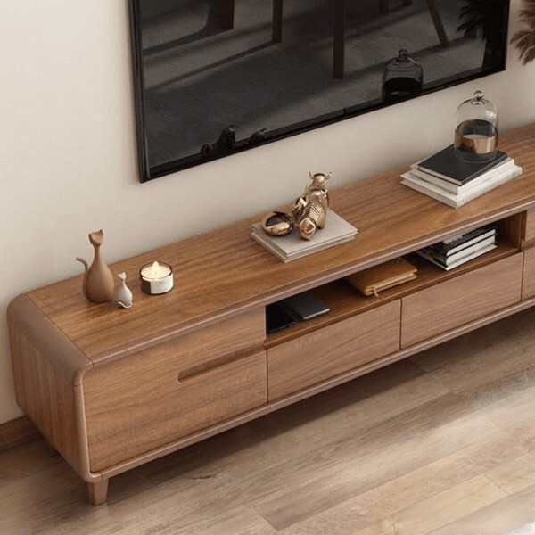 这款电视柜展现了巧妙的储物设计,柜体的实木边框和丰富的内部空间能够便捷存放各种电子设备、书籍及装饰品。无论是日常收纳还是展示,皆能满足您的需求,让客厅环境整洁有序,同时避免杂物的堆积。