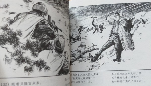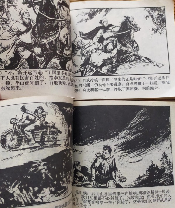 剑,在战争体裁书里,与李自成石门平叛、南原激战风格近、水平不分仲伯。图(2上)李自成、(2下)剑。感觉剑与顾炳鑫的三勇士,是抗美援朝题裁里画得最好的,图3三勇士。剑(上),在网上都找不到几本好品相的了,昨我把最好的一本挑走。