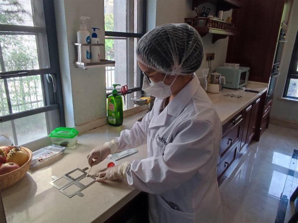随后,悦呼吸的采样人员在黄女士家里选择了餐桌和储物柜两处进行采样,并且按规范操作,分别在两处取样点都进行了两次采样。
