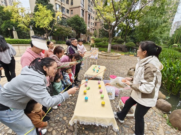 不远处的民俗游戏闯关区,更是热闹非凡,党员志愿者化身“游戏引导员”,全力保障互动安全有序。“套鸡蛋”游戏前,老人和孩子屏气凝神,瞄准、投掷,每一次套中都引来阵阵欢呼;“拍洋画”的桌旁,老人熟练地演示着儿时玩法,孩子则好奇模仿,在一翻一扣间,两代人共享着童年的欢乐;“钓蔬菜”的绳索一上一下,钓起的不仅是一颗颗新鲜蔬菜,更是老少同乐的开怀笑意。这些怀旧游戏让老人重拾童年记忆,也让孩子在趣味互动中解锁了民俗文化的魅力,更让党员志愿者与居民的距离在互动中不断拉近。