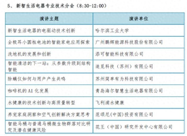 据了解,2025年技术大会“新智生活电器”分会场将以更鲜活生动的形式和内容吸引更多企业代表参加会议,交流分享先进技术成果。目前,“新智生活电器”分会场会议议题已经确认,主要涉及的小家电产品品类将分为电动和电热两大类,包括扫地机器人、洗地机、除螨仪、咖啡机、净饮机、宠物空气净化器、智能坐便器等诸多趋势性产品的技术创新成果展开。尤为值得一提的是,“新智生活电器”分会场邀请到的演讲嘉宾为来自知名大学的具有丰富产学研经验的教授、各品类的优秀整机品牌以及产业链上游企业的技术专家。届时,交流内容将围绕共性技术和细分品类技术依次展开,凸显新智生活电器的智能、健康、个性、集成、便捷、绿色的发展特征。