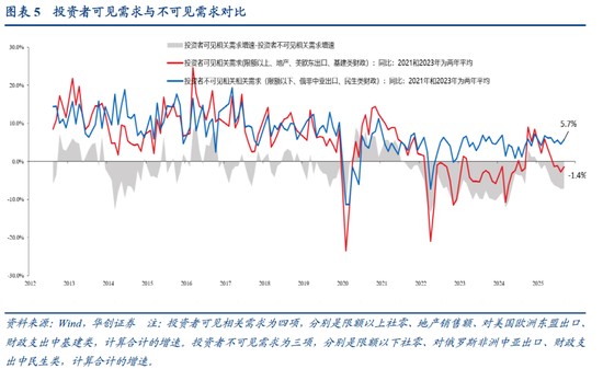 1)若以资本市场的视角看经济(更关注可以转为上市公司盈利的经济环节),则投资者“可见需求”与“不可见需求”的分化同样在加大。9月,投资者可见需求(包括限额以上社零、地产销售额、对美国欧洲东盟出口、财政支出中基建类)增速为-1.4%。投资者不可见需求(包括限额以下社零、对俄罗斯非洲中亚出口、财政支出中民生类)增速为5.7%。此前,2024年四季度,投资者可见需求增速连续三个月超过不可见需求增速。