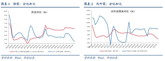 1)供需的分化。3季度,实际GDP增速为4.8%,但名义GDP增速为3.7%。若观察工业品的供需,以工增代表产出,以社零、固投、出口代表工业品的需求。则,前三季度,工增增速为6.2%,需求增速为2.98%,增速差达到3.2%。