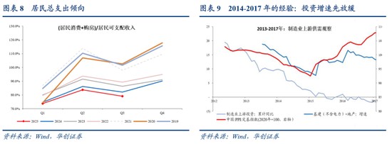 4、稳预期,第一个层面,是偏长期,对经济转型彼岸的现代化、打赢未来人类科技主战场攻坚战的信心。第二个层面,是实现中期物价回升的信心,在产能利用率偏低的背景下,实现物价回升需要先压低产能增长速度,生产性投资需回落,当下制造业投资增速偏低,该前置条件已出现,已与过去三年有了不同的期待。第三个层面,是基于短期目标实现的信心,在前三季度增长5.2%的背景下,实现全年目标需要的四季度增速在4.5%左右,这一方面结合增量政策部署,胜率较高。第四个层面,是针对高频运行中可清晰观测、居民直接体感偏强的价格信号——股价与房价。