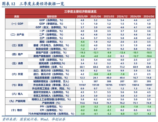 3季度,GDP增速为4.8%,前值为5.2%,前三季度累计增速为5.2%。3季度名义GDP增速为3.7%,季调环比为1.1%。物价方面,3季度PPI同比均值为-2.9%,前值为-3.2%。CPI同比均值为-0.2%,前值为0%,70大中新建住宅价格同比为-3.0%,前值为-4.1%。