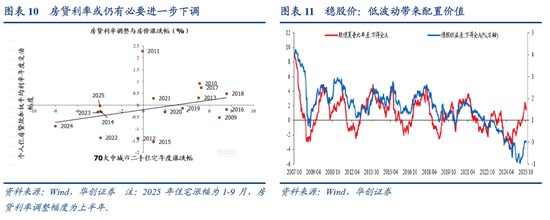 1)对于稳房价,后续或需继续降低房贷利率。我们计算每年二手房的涨跌幅以及房贷利率的调整。二手房房价采用统计局的70城数据,房贷利率为央行公布的个人住房贷款加权平均利率。我们发现,今年1-9月,二手房累计跌幅为3.93%,但房贷利率仅下降3个bp。此前,房价跌幅相近的年份如2024年、2023年、2022年、2014年,房贷利率调整幅度都在25个bp以上。后续,房贷利率或仍有必要进一步下调。