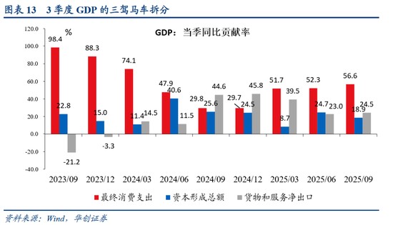 根据统计局的解读,“三季度最终消费支出对经济增长贡献率为56.6%,拉动GDP增长2.7个百分点。消费需求是拉动经济增长的主要动力。三季度资本形成总额对经济增长贡献率为18.9%,拉动GDP增长0.9个百分点。三季度货物和服务净出口对经济增长贡献率为24.5%,拉动GDP增长1.2个百分点。”