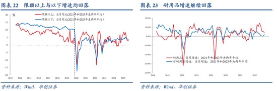 3)受耐用品的基数抬升影响,限额以上耐用品增速继续回落,9月同比为4.1%,前值为5.4%。其中,家电增速为3.3%,前值为14.3%;文化办公用品增速为6.2%,前值为14.2%。