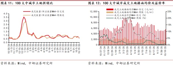 (2)二手房成交及挂牌:上周20城二手房成交面积为215.09万方,本年累计二手房成交面积为8859.15万方,累计同比+13.4%。20城近四周平均成交面积为166.91万方,同比-11.6%,环比+0.6%。截至2025/10/6全国城市二手房出售挂牌量指数为6.5,环比-13.4%,挂牌价指数为150.59,环比-0.19%。