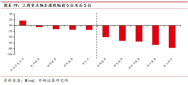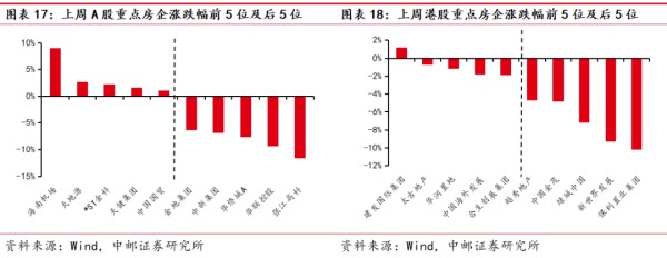 上周重点A股房地产个股涨幅居前的分别为:海南机场(+8.96%)、天地源(+2.72%)、*ST金科(+2.21%),重点港股房地产个股涨幅居前的分别为:建发国际集团(+1.16%)、太古地产(-0.74%)、华润置地(-1.15%),重点物业服务企业涨幅居前的分别为:华润万象生活(+1.69%)、金科服务(-0.6%)、融创服务(-1.27%)。