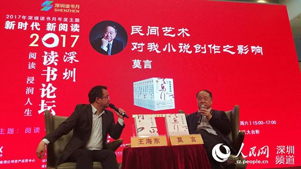 “民间生活是所有艺术创作的原料库。”“精彩小说的关键,是强烈的戏剧性。”“当我提笔写作时,我会忘掉自己的年龄。”……11月11日,在深圳中心书城南区大台阶,诺贝尔文学奖得主莫言出席第十八届深圳读书月读书论坛,以“民间艺术对我小说创作之影响”为题,分享其小说创作心得。他提出,要创作出具有民族特色的艺术作品,应该到民间寻根。