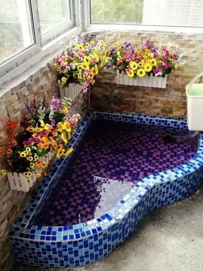 在封闭式的阳台上,给小宝贝做个小水池,里面养几条小鱼,窗台矮墙上放几盆花篮,让孩子搬个小凳子在这里玩钓鱼吧!