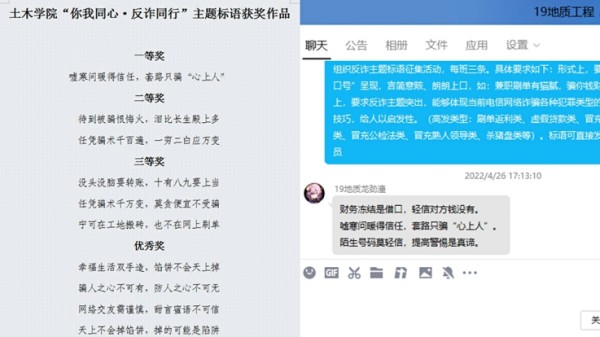 为了加大反诈宣传教育力度,提高学生安全意识,在校园形成防诈骗、反诈骗的浓厚氛围。4月26日,土木学院反诈标语征集大赛正式启动。