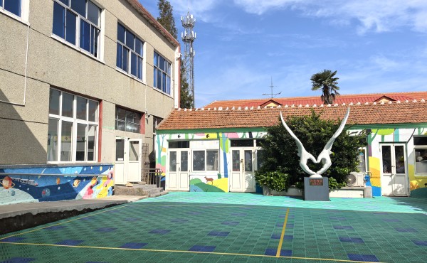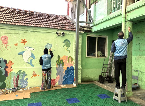 作为本次环境升级的亮点,院落墙体彩绘围绕“海洋世界”“森林奇境”“星际探索”三大主题展开,结合建筑墙体、院落绿植与雕塑等现状条件,精心设计出与原有环境相融合的色彩视觉场景。彩绘工作融合了艺术构思与童真笔触,充分体现公共空间共创理念,由市公共空间艺术促进中心的党员志愿者、设计师以及同行之家的孩子们共同完成。