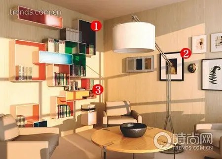 1、墙面上的收纳格满足随手收纳的需要,也为部分装饰物提供展示空间,凸出来的部分可当做多用桌满足临时看书或用餐的需要。
