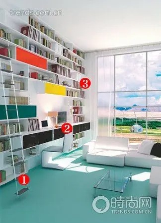 1、不常用的藏书可以放在书架的上部,滑轮梯使上下取放书变得方便。