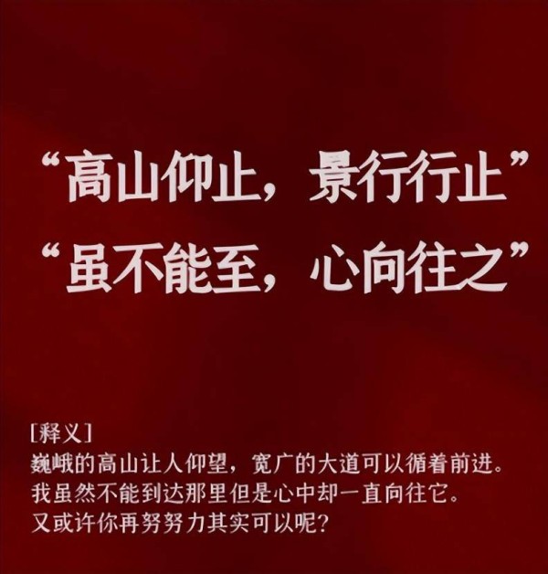这句出自《诗经・小雅・车辖》,它表达了对高尚品德的敬仰之情。虽然我们可能无法达到那些圣贤的完美境界,但只要心中有向往,就能够在自我完善的道路上不断前进。