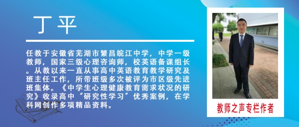 作者介绍:丁平,任教于安徽省芜湖市繁昌皖江中学,中学一级教师,国家三级心理咨询师,校英语备课组长。从教以来一直从事高中英语教育教学研究及班主任工作,所带班级多次被评为市区级先进班集体。 《中学生心理健康教育需求状况的研究》收录高中“研究性学习”优秀案例,在学科网创作多项精品资料。