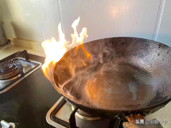 首先将铁锅放在煤气灶上,开大火先给它烧一下,记得开抽油烟机,这里会产生比较大的油烟,等到锅中开始冒烟的时候,我们就要着重的来烧一下了,千万不要害怕会把锅烧坏,这点火力,铁锅还是承受得住的。