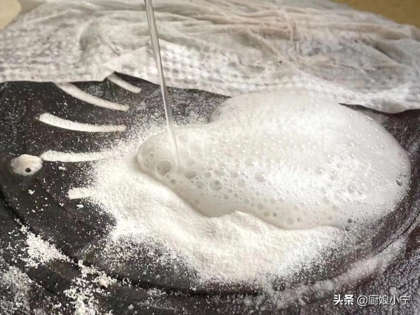 首先将小苏打倒在锅底,然后淋上适量的白醋,你会看到神奇的一幕,那就是这两者接触后产生了丰富的气泡,待气泡小时候,我们戴上手套把锅底抹匀,然后盖上厨房纸,静待半小时的时间。