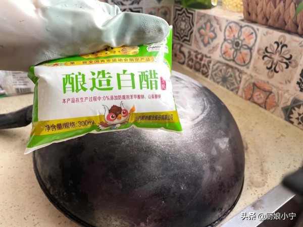 将锅底灰全部铲干净以后,如果发现还有非常难处理的位置,需要我们再次上火给它着重的再烧一下,如果全部的灰都清理干净了,就会发现锅底虽然没有油垢,但是也没有光泽,用水把锅底清洗干净后,这里需要我们用到另一个小妙招:白醋和小苏打。
