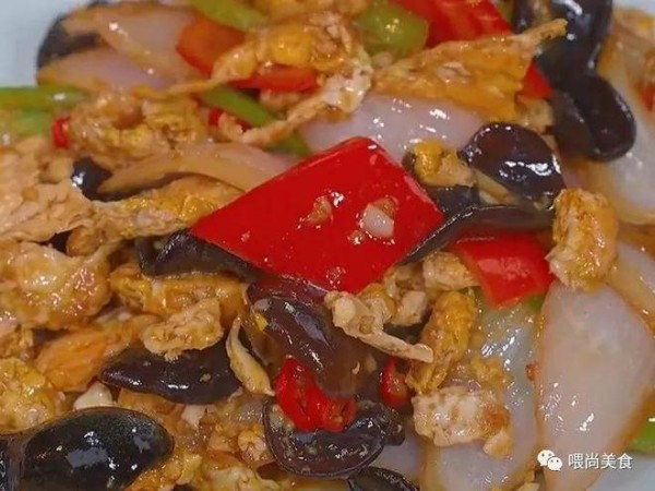 4、锅留底油,放入蒜蓉、小米辣,洋葱下锅煸炒出香味,再放入青红椒、木耳,炒熟的鸡蛋,翻炒均匀,淋入调好的料汁,再开大火翻炒均匀即可。