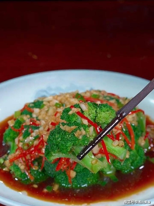 4、空碗中加蒜末、葱花、红椒丝,用热油激发出香味,再加入一勺白糖、生抽和陈醋,搅拌成料汁浇在西兰花上即可。