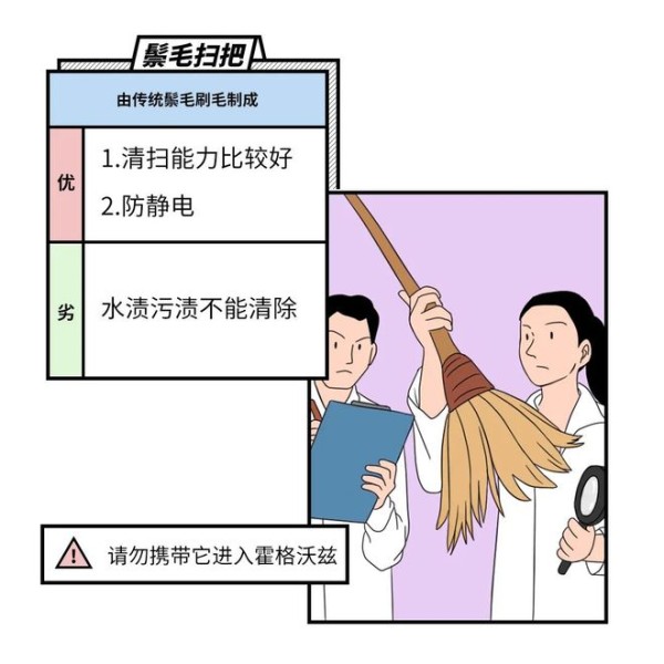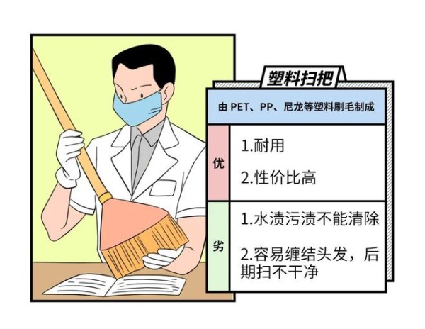 家庭中的扫把,可以从刷毛的密集度来选择,以刷毛顺滑、不容易粘毛为优。常见的以塑料扫把和鬃毛扫把为主。