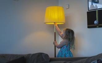 落地灯对小孩具有诱惑力,尤其是灯上的开关。孩子喜欢去拉电线,因而将落地灯拉倒而砸在脚上或头上。最好不要用铜的或大理石底座的,或者根本不用落地灯。