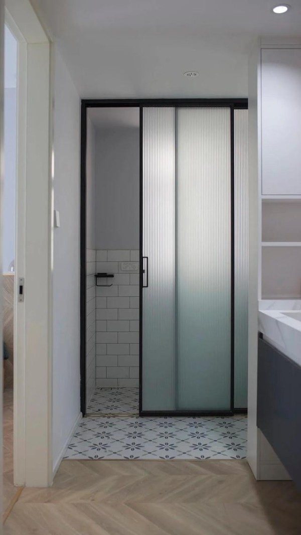 独立马桶区,利用长虹玻璃推移门隔断,保持私密性,又增加透光效果。