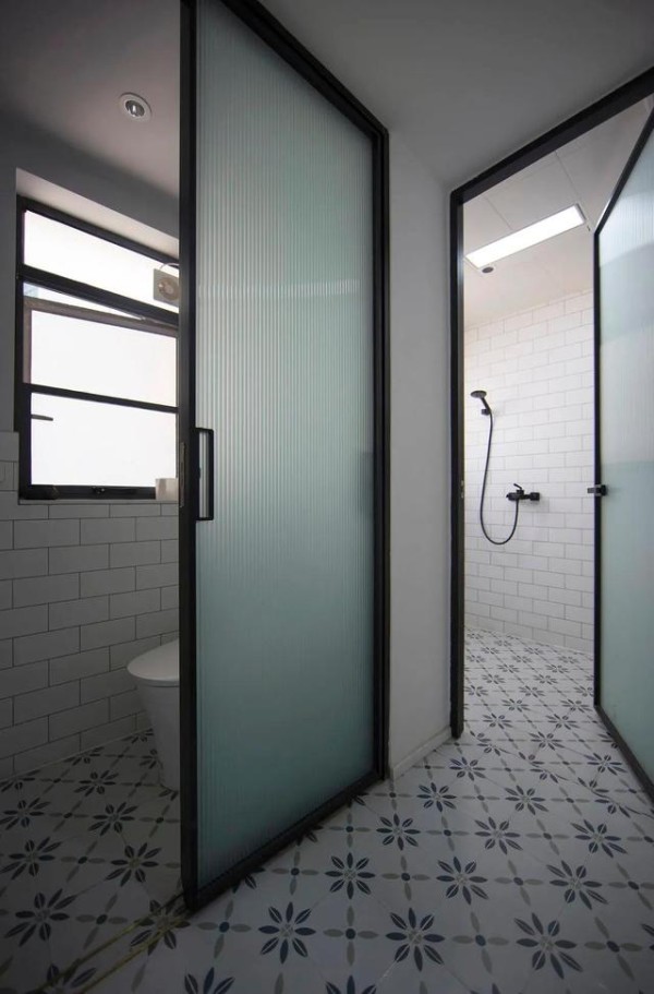 马桶区和淋浴区采用拼花地砖、白色面包墙砖,整体感好也更明亮。