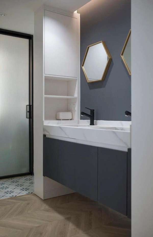 洗漱区采用双洗手台盆设计,为高峰期使用提供了便利。台盆左侧做储物柜,利用六边形镜子的几何造型打破空间沉闷感。