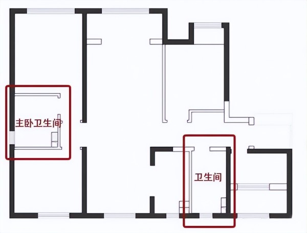 ▼下面户型图中,有两个卫生间,一个在主卧,一个在玄关走廊处。为了卫生间扩容,都将洗漱台往外移。