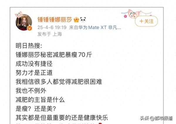 锤娜丽莎回应称“下午5点30之后不吃任何东西”,辟谣喝“减肥药”瘦身传闻,瘦身方式是针灸、调整饮食以及做节律性运动,并强调“没吃减肥药没打针”。