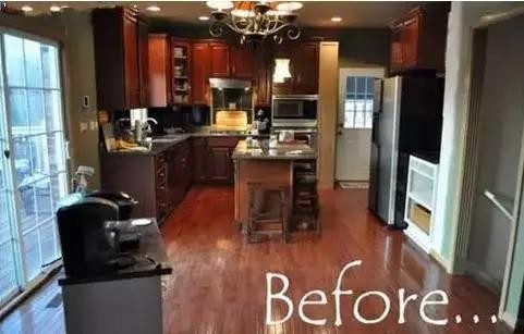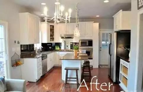没有自然光进入的厨房,橱柜的颜色可以选择浅色系,让人看起来清新明亮,拉升空间;另外,也可以在设计墙面与柜体的颜色时使用对比色,比如咖啡色的墙面与白色的柜体搭配,巧妙运用对比色可以增强房间的空间感。
