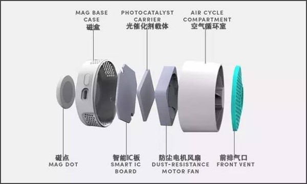 VentiFresh 由带磁性小纽扣、磁盒、智能IC板、光催化剂载体、防尘电机风扇、空气循环室、排气口等部件组成,体积小巧重量仅有70g。。。