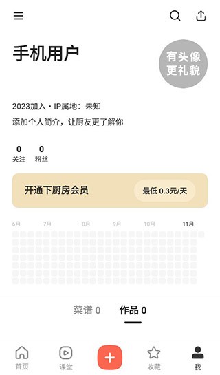 用户点击下方我的即可进入个人中心,可以查看自己的菜谱和作品,以及自己的账号信息