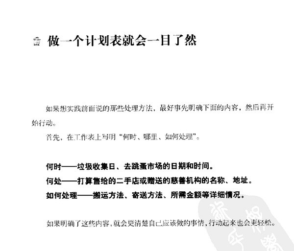 16、'只出不进'的小秘诀:首先,准备多个箱子或者大袋子。然后,把家中没用的洋服或者书籍,按照 出售、捐献、再利用、扔掉分好类,并对抽屉、书架、一直无人问津的箱子中进行----排查。不要奢求自己可以一口气把所有东西都收拾好。可以先制订一个类似 两周整理号一个地方这种符合现实的目标。
