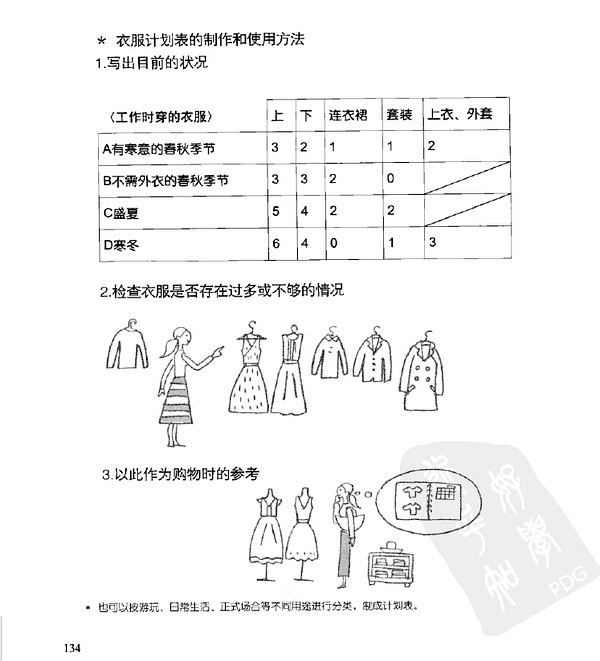 ・首先,列出自己生活中必须穿的衣物的件数和种类。